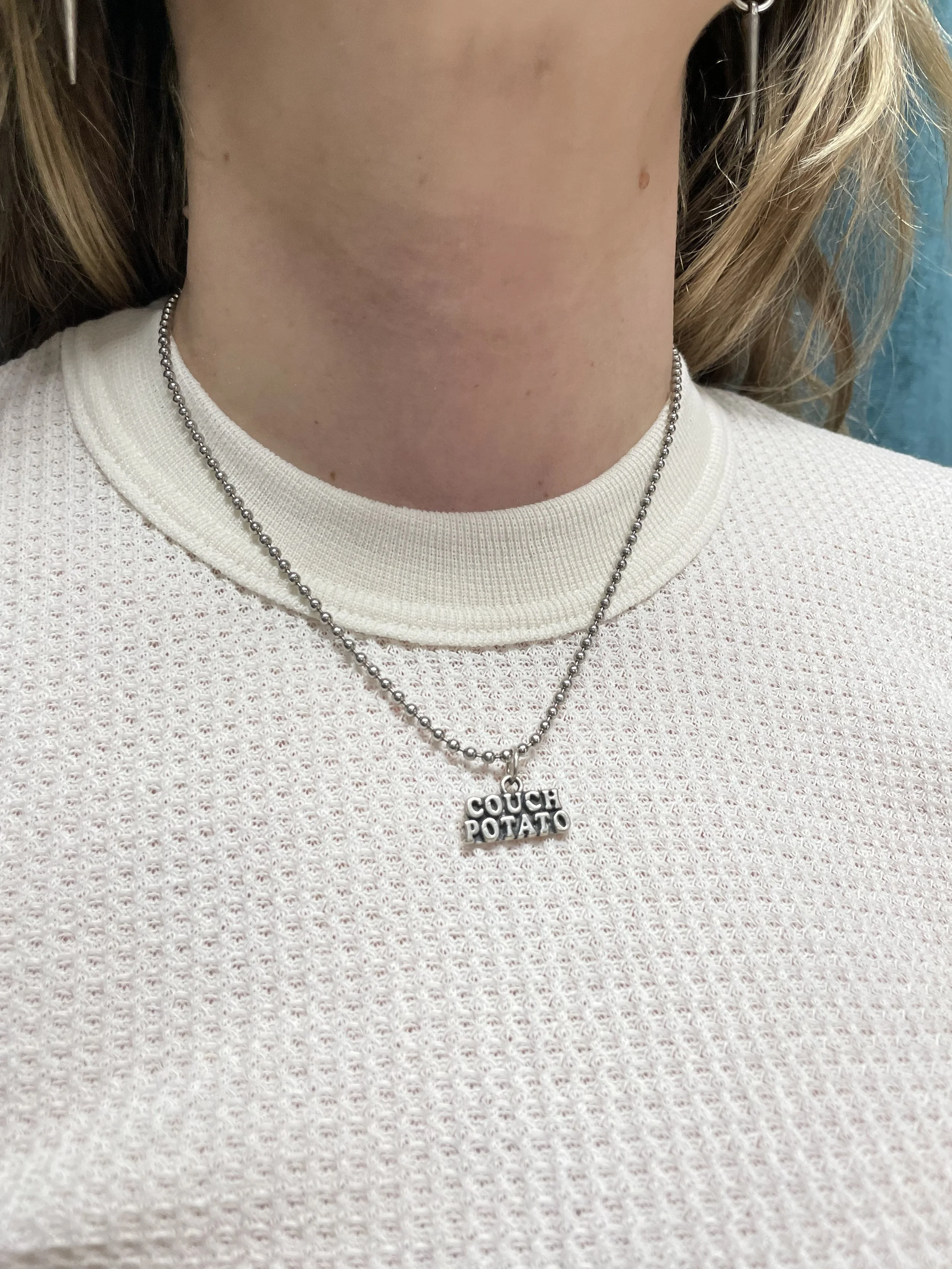 Image 1 of 2 Image 2 of 2 Couch Potato Necklace $25.00 Limited Availability A vintage charmed necklace made from .925 sterling silver. Ball chain, lobster claw clasp. CHAIN LENGTH 15” Get notified by email when this product is in stock. Sign up to receive the latest on new product drops, see when sales are happening, and to be notified when your favorite products are back in stock. Add To Cart Added! A vintage charmed necklace made from .925 sterling silver. Ball chain, lobster claw clasp. CHAIN LENGTH 15” Reviews Reviewer Name Review Date Star Rating Description Posted on Etsy Product Show More